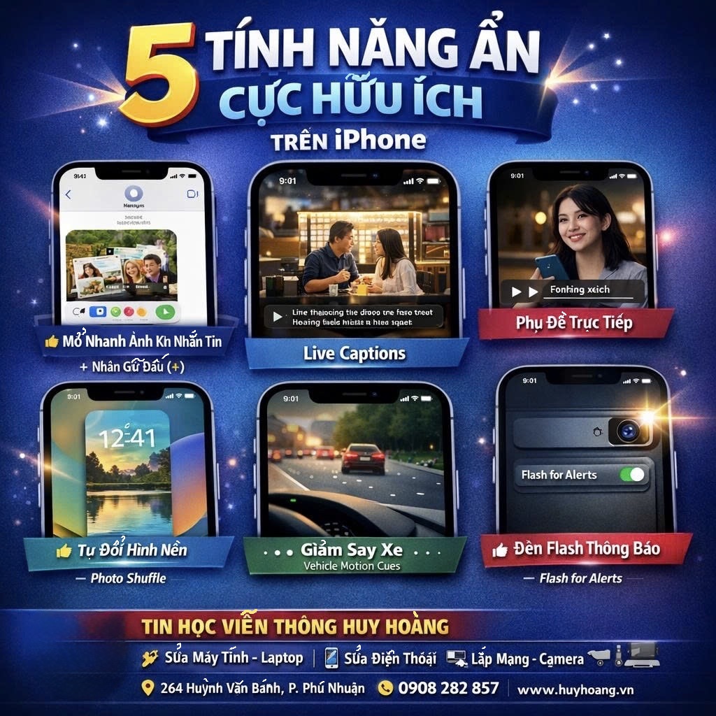 Khám phá 5 tính năng ẩn hữu ích trên iPhone như mở nhanh ảnh khi nhắn tin, phụ đề trực tiếp Live Captions, tự đổi hình nền Photo Shuffle, giảm say xe và đèn flash báo thông báo giúp sử dụng điện thoại tiện lợi hơn mỗi ngày.