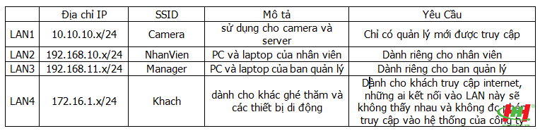 Lan4: dành cho khách viếng thăm, chủ yếu phát wifi cho khách viếng thăm. Các client khi kết nối vào mạng này sẽ không truy cập được lẫn nhau và không truy cập được vào mạng của công ty. Nhưng vẫn có thể truy cập internet.