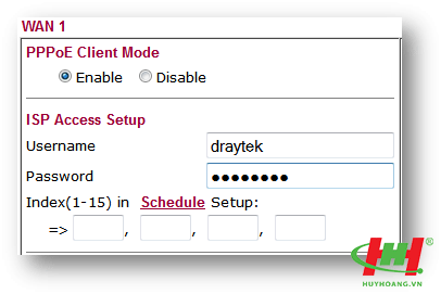 Vào mục wan => internet access => Access mode của wan1 chọn PPPoE. Chọn Enable và khai báo user name và mật khẩu của đường truyền cáp quang