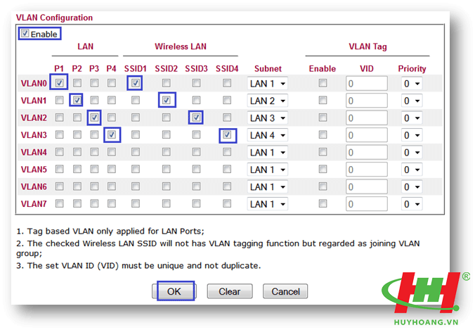 Vào LAN => VLAN chọn Enable và đánh các dấu chọn như hình dưới.