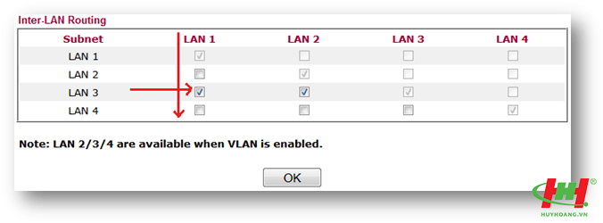 Dễ thấy, muốn cho LAN 1 thấy LAN 3 ta chỉ việc tick vào điểm giao nhau giữa 2 LAN. Các LAN khác không được chọn sẽ không trao đổi dữ liệu với nhau được nhưng vẫn có thể truy cập internet bình thường. Như hình trên thì LAN 1 sẽ không thấy LAN 2, LAN 1 sẽ không thấy LAN 4, LAN 2 cũng không thấy LAN 4.