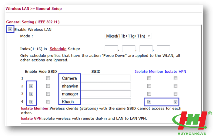 Riêng SSID 4 : Khach chọn thêm mục Isolate Member và Isolate LAN để cấm truy cập lẫn nhau và cấm truy cập vào các máy tính đang VPN về mạng của công ty. Mục đích nhằm làm tăng thêm tính bảo mật cho khách viếng thăm và cho công ty.
