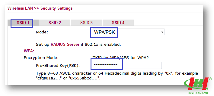 a. Khai báo mật khẩu cho từng SSID Vào Wireless LAN => Security=> Chọn SSID 1 => Chọn kiểu mã hóa và đặt mật khẩu cho SSID này theo ý muốn như hình sau:
