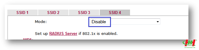 Làm tương tự với SSID 2 và SSID 3. Mỗi SSID bạn nên đặt mật khẩu khác nhau để tăng thêm tính bảo mật. Riêng SSID 4 dành cho Khách không cần đặt mật khẩu. Ta để mặc định Mode Disable.