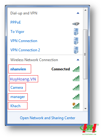 Sau khi hoàn tất việc đặt mật khẩu cho mạng Wireless => click OK để lưu cấu hình. Kết quả thu được khi dùng 1 máy laptop dò mạng Wireless. Kết nối với SSID nào thì sẽ nhận được địa chỉ IP LAN tương ứng với LAN đó.