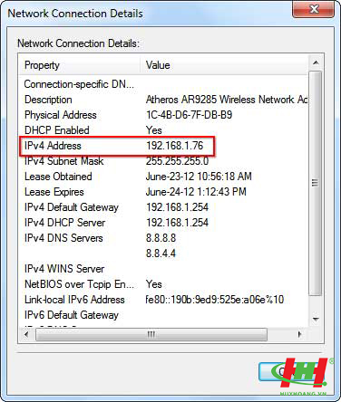 Ta sẽ thấy một địa chỉ IP được liệt kế trong cửa sổ thông tin chi tiết của kết nối. Hãy tìm trường IPv4 Address.