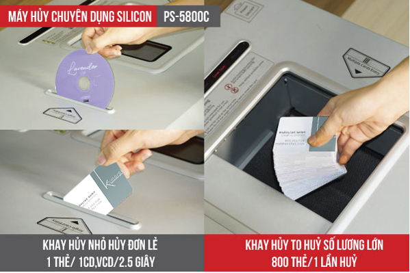 Máy hủy Silicon PS-5800C được hãng Silicon USA vừa cho ra mắt năm 2019 là dòng máy chuyên dụng để huỷ số lượng lớn thẻ tín dụng, thẻ ATM, thẻ hội viên, CD/VCD... dành cho khách hàng là ngân hàng, tài chính, y tế, bảo hiểm, hàng không…