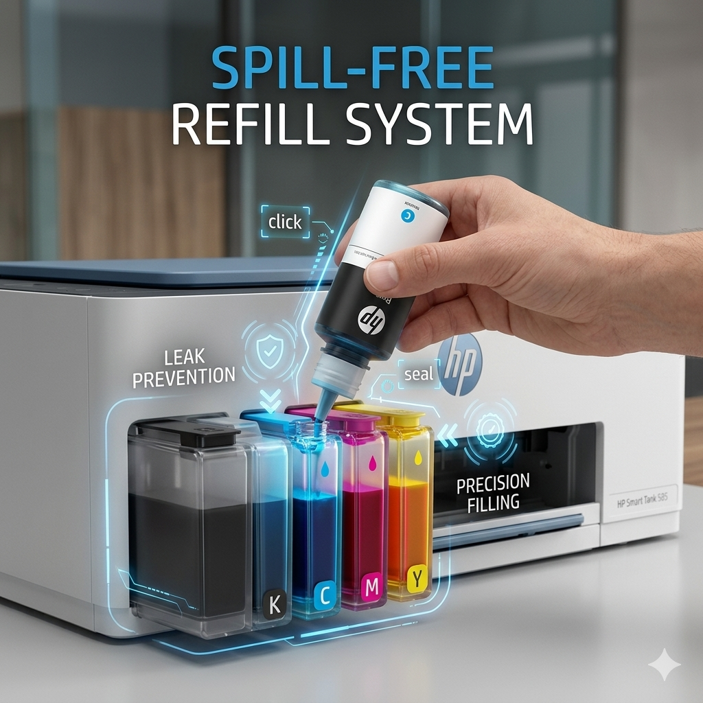 Công nghệ nạp mực chống tràn giúp việc thay mực sạch sẽ và dễ dàng hơn bao giờ hết.Không còn nỗi lo rớt mạng hay dây cáp lằng nhằng. HP 585 trang bị công nghệ Wi-Fi tự phục hồi (Self-healing Wi-Fi), tự động phát hiện và giải quyết các sự cố kết nối để đảm bảo máy in luôn sẵn sàng.