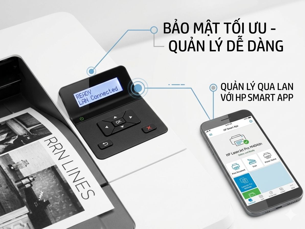 (Mô tả: Hình ảnh cận cảnh bảng điều khiển LCD. Đồ họa minh họa kết nối từ điện thoại đến máy in thông qua ứng dụng HP Smart khi cùng mạng LAN với dòng chữ: "BẢO MẬT TỐI ƯU - QUẢN LÝ DỄ DÀNG").